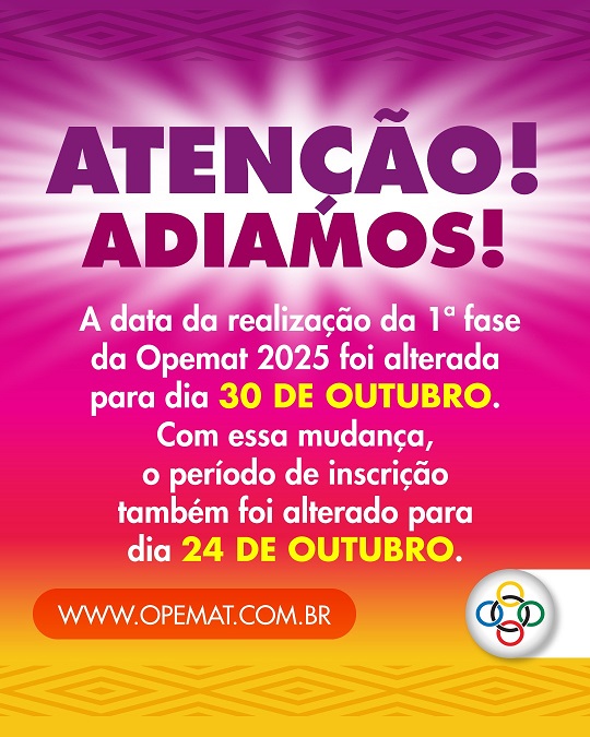 Este ano, a OPEMAT 2025 será realizada em duas fases e contará com os seguintes polos de aplicação: Afogados da Ingazeira, Belo Jardim, Cabo de Santo Agostinho, Caruaru, Garanhuns, Nazaré da Mata, Ouricuri, Pesqueira, Petrolina, Petrolândia, Poção, Quixaba, Recife, Santa Maria da Boa Vista, São José do Egito, São Lourenço da Mata, Serra Talhada, Trindade e Tupanatinga. A primeira fase consiste em uma prova de 12 questões objetivas e será realizada em cada escola inscrita e ocorrerá dia 21 de outubro de 2025 com duração de 2h30m. A segunda fase, que será realizada nos polos de aplicação ocorrerá em 14 de março de 2026 às 13:00 com duração de 4h e será composta de 5 questões dissertativas.